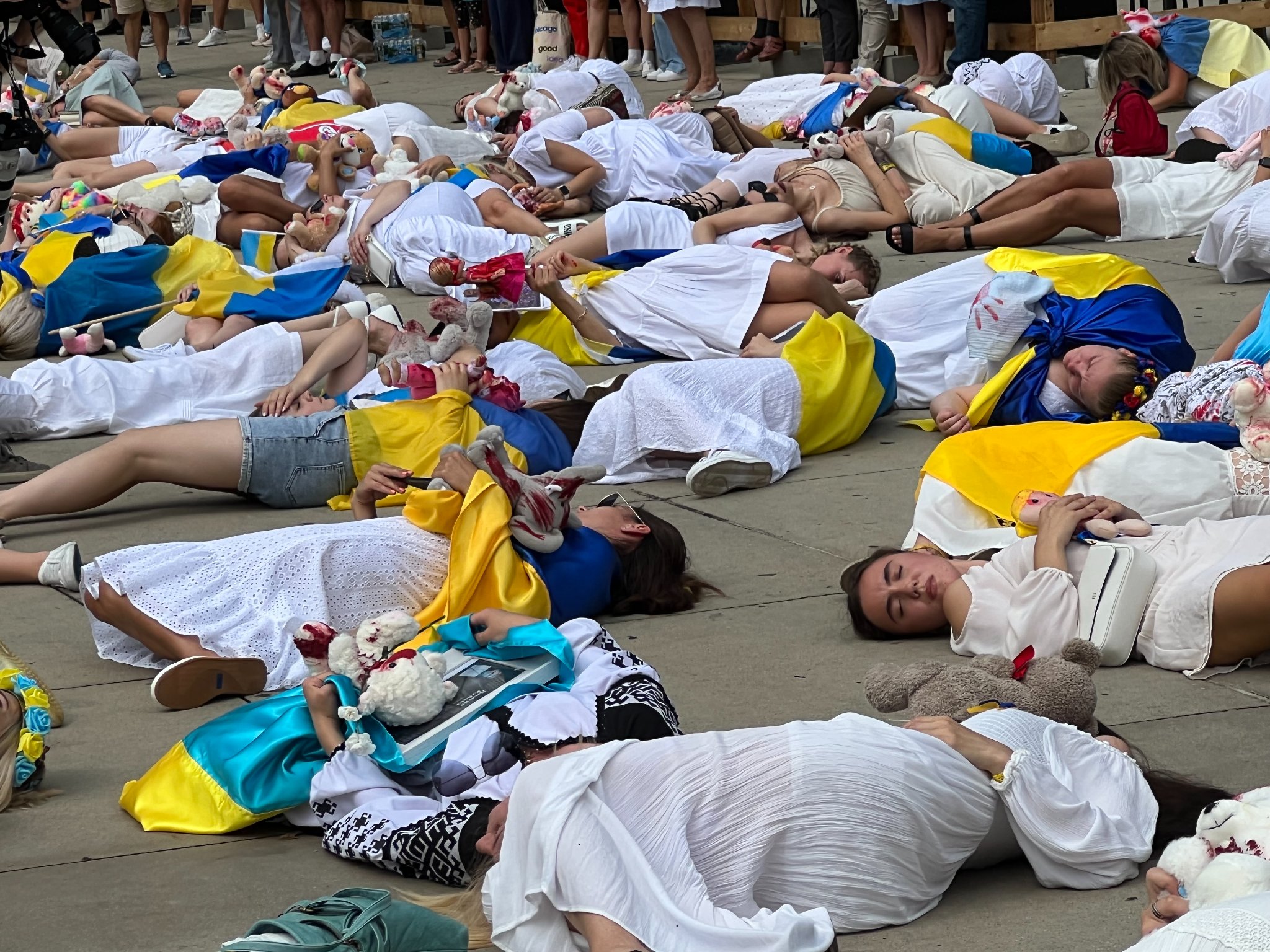 On July 24, about 350 people rallied in Chicago, IL, demanding that the United States proclaim russia as a state sponsor of terrorism, increase weapons supply to defend Ukraine, and save Ukrainian children. The march, organized by Ukrainian-American women with assistance from UCCA Illinois Division, started at Water Tower and proceeded on Michigan Avenue to Millennium Park. It “culminated with a powerful dramatic performance when to the sound of sirens and then three strong sounds of bombs falling, over 100 young women fell to the ground,” according to a Facebook post by Marta Farion, member of the UWC Board of Directors and Vice-president of the UCCA-Illinois.