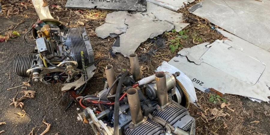 Above: Fragments of destroyed Iranian drones. Ukraine is learning to defend against these kamakazis used by the enemy to wage war on civilians. (New Voice of Ukraine)