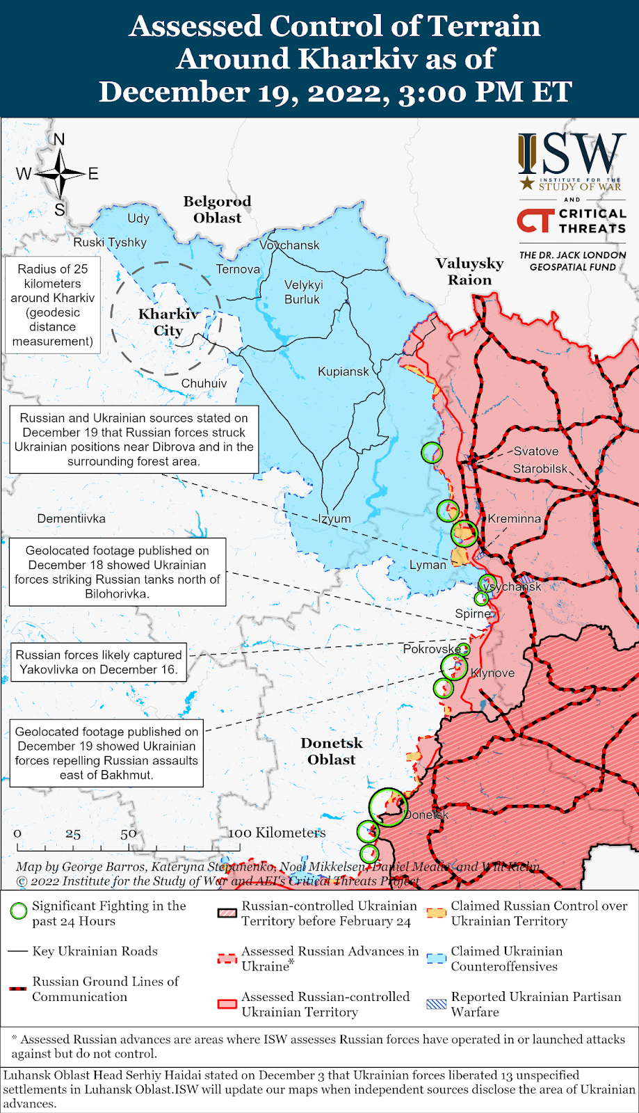 Map via ISW- Russian forces continued limited counterattacks to regain lost positions along the Svatove-Kreminna line on December 18 and 19. The Ukrainian General Staff reported that Ukrainian troops repelled Russian attacks near Stelmakhivka (15km west of Svatove) between December 18 and 19.