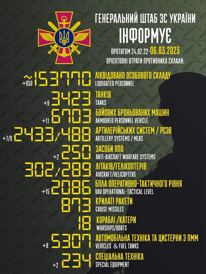 - During the day of March 5, the adversary launched 31x air strikes and 8x missile strikes. The invaders launched more than 70x MLRS attacks. The threat of further missile strikes by Russia is highly probable across Ukraine.