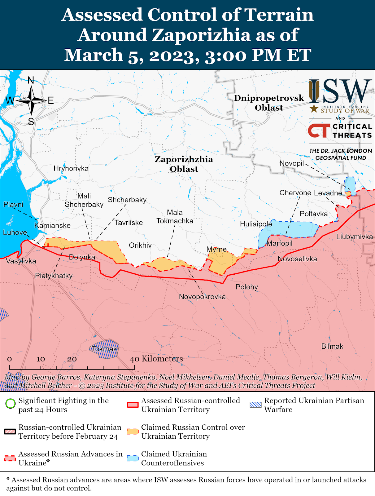 - The likely imminent culmination of the Russian offensive around Bakhmut, the already culminated Russian offensive around Vuhledar, and the stalling Russian offensive in Luhansk Oblast are likely setting robust conditions for Ukrainian counteroffensive operations.