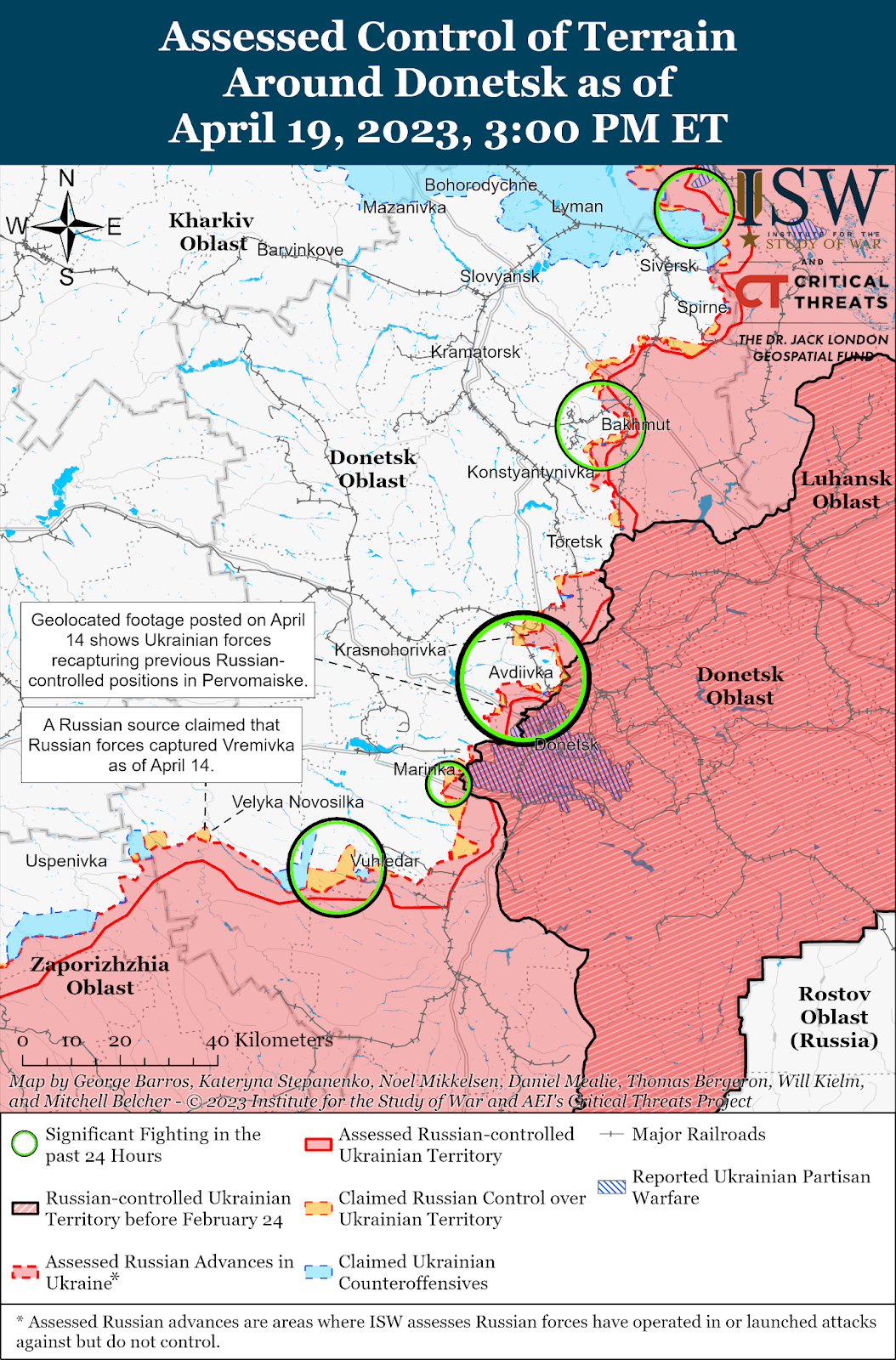 - Russian forces continued ground attacks along the Avdiivka-Donetsk City frontline on April 19. Russian forces conducted unsuccessful offensive actions in the Avdiivka area towards Avdiivka itself; Stepove (7km northwest of Avdiivka), Berdychi (10km northwest of Avdiivka), and Sieverne (5km west of Avdiivka); on the northwestern outskirts of Donetsk City near Vodyane, Pervomaiske, and Nevelske; and on the southwestern outskirts of Donetsk City near Marinka and Pobieda.