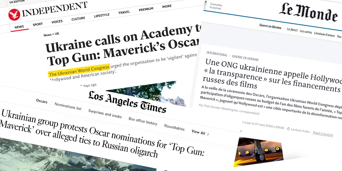 The Ukrainian World Congress appeal to the Academy of Motion Picture Arts and Sciences calling for the withdrawal of “Top Gun: Maverick,” a film funded by a Russian oligarch, from the 95th Academy Awards, was widely picked up and commented upon by the global and Ukrainian media.