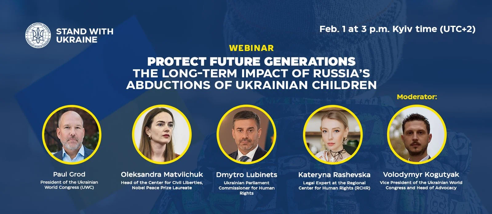 The event will feature prominent speakers, including Paul Grod, President of the Ukrainian World Congress; Oleksandra Matviichuk, Chair of the Center for Civil Liberties and Nobel Peace Prize laureate; Dmytro Lubinets, Ukraine’s Parliamentary Commissioner for Human Rights; and Kateryna Rashevska, an expert in international humanitarian and criminal law. The webinar will be moderated by Volodymyr Kogutyak, UWC Vice President and Head of Advocacy.