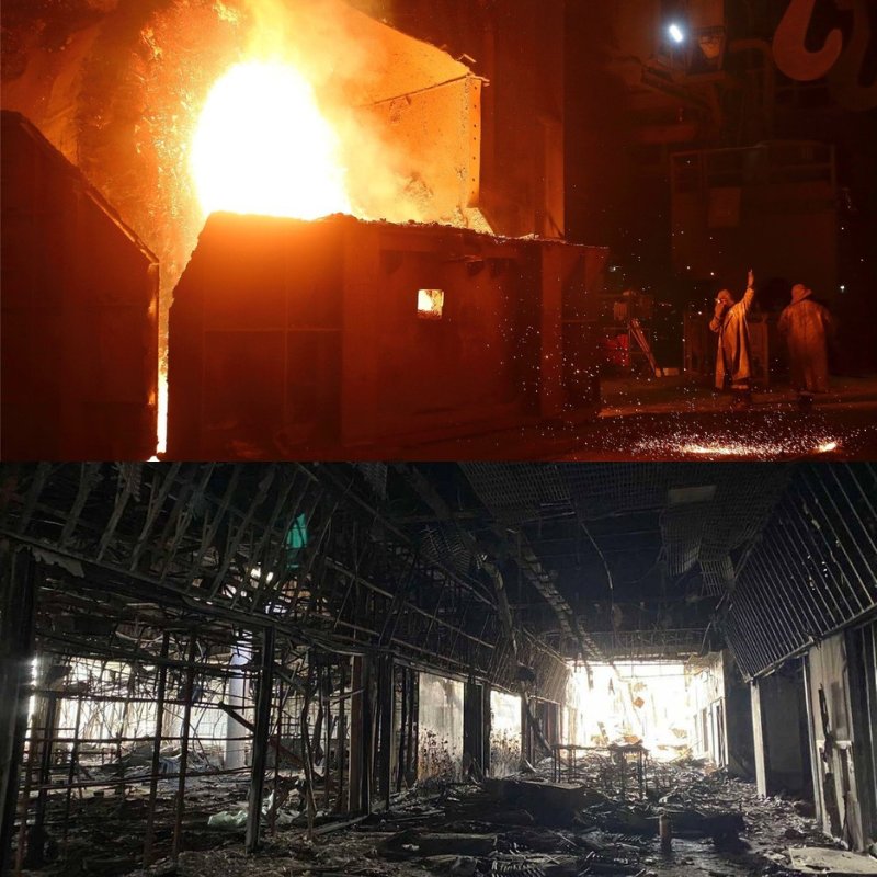 A before-and-after collage illustrating the dramatic decline of Mariupol’s Illich Steel and Iron Works.