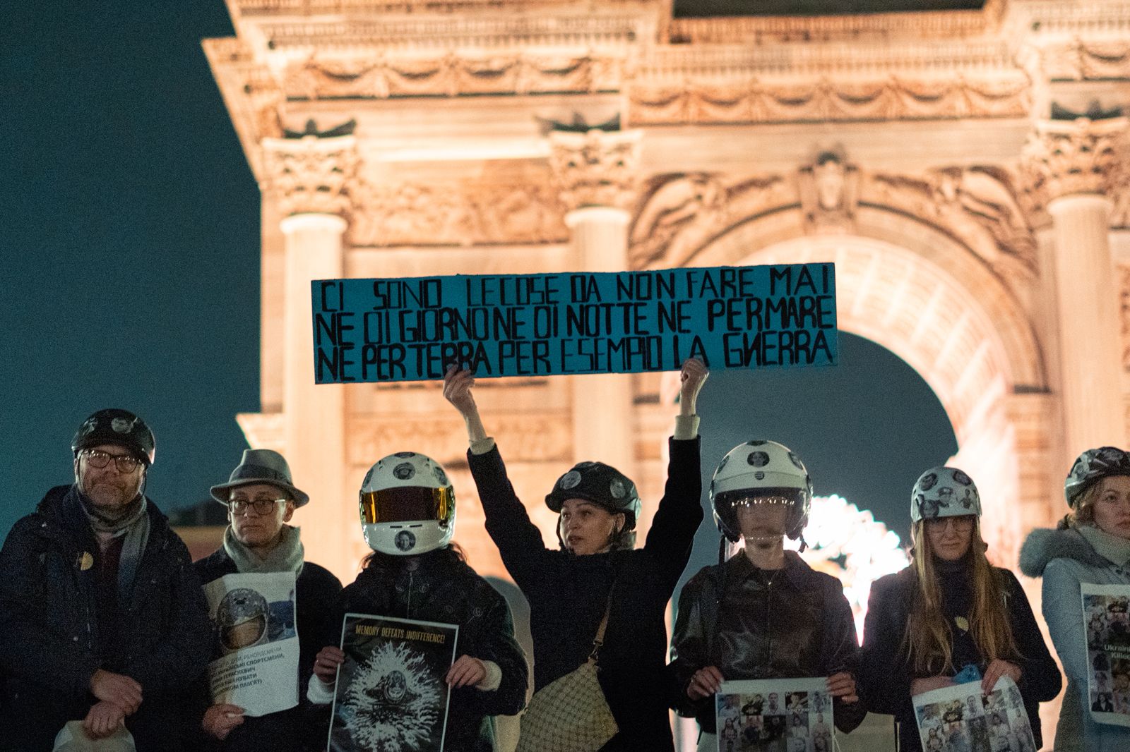 Близько 15 учасників зібралися біля Арки миру й одягнули шоломи з портретами загиблих атлетів.