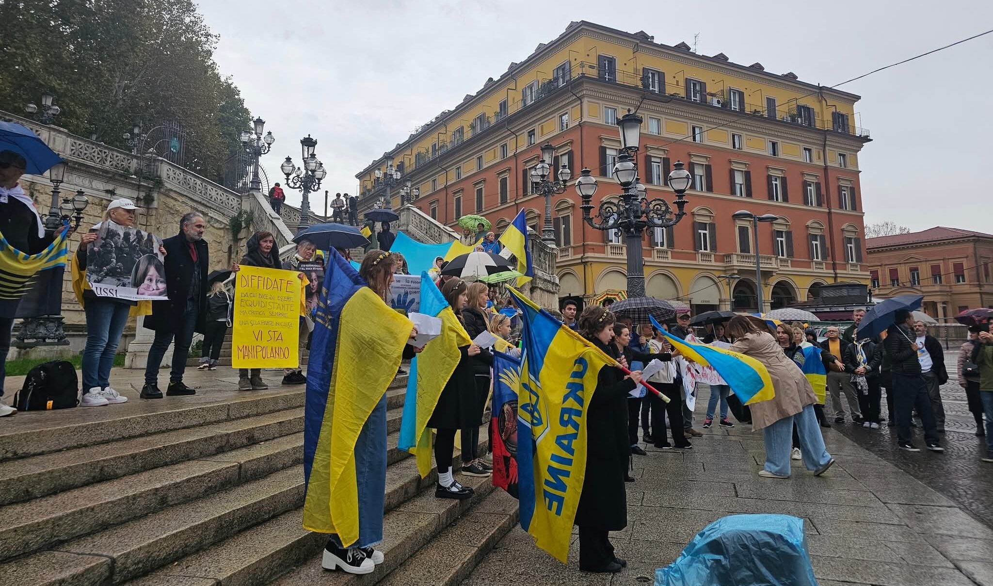 Близько трьохсот учасників — українці, італійці, представники громадських організацій і партій — пройшли від площі Єдності до парку Монтаньола під жовто-блакитними прапорами. Активісти несли плакати із закликами зупинити російську агресію та пропаганду.