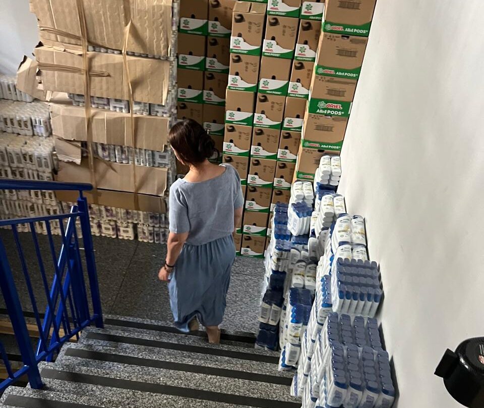 Сьогодні вантажили буси, які йдуть на фронт, їдуть волонтери на фронт, ми їх завжди довантажуємо, там бачите, шампуні чоловічі, там якісь бритви якісь, мівіни всякі різні, там супи й шоколадки й так далі.