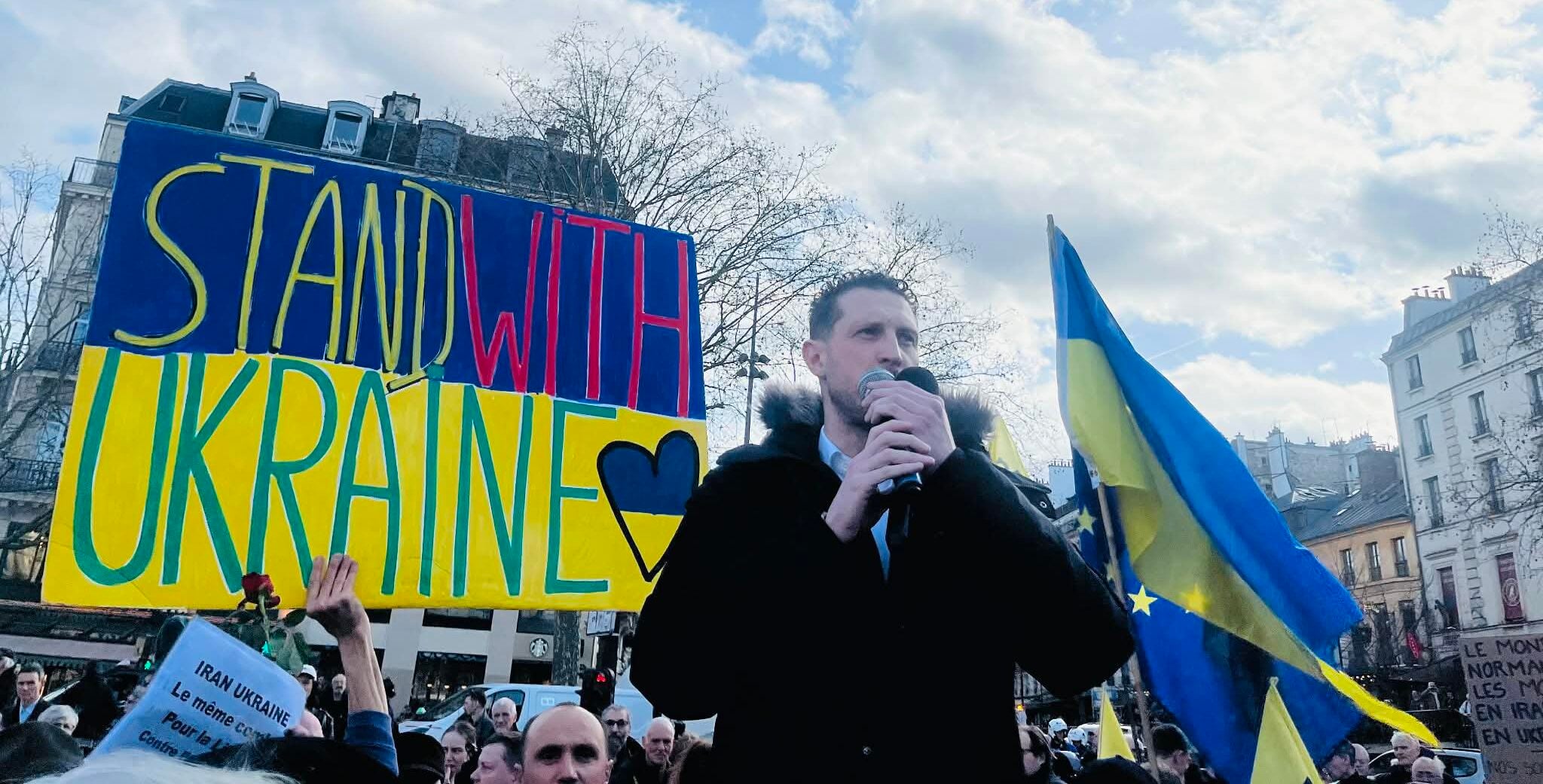 UWC Vice President Volodymyr Kogutyak addresses a pro‑Ukraine rally in Paris on Feb. 24