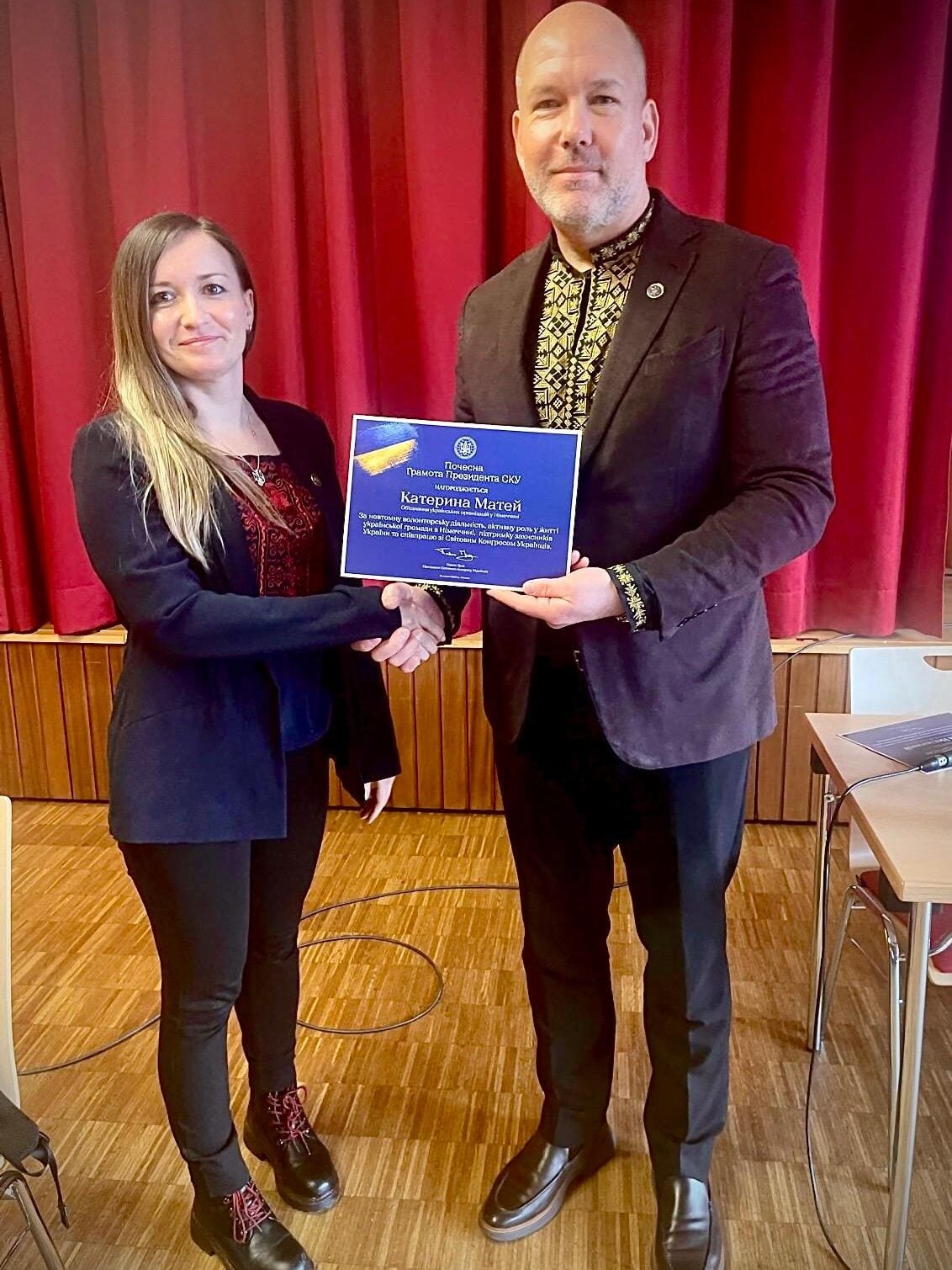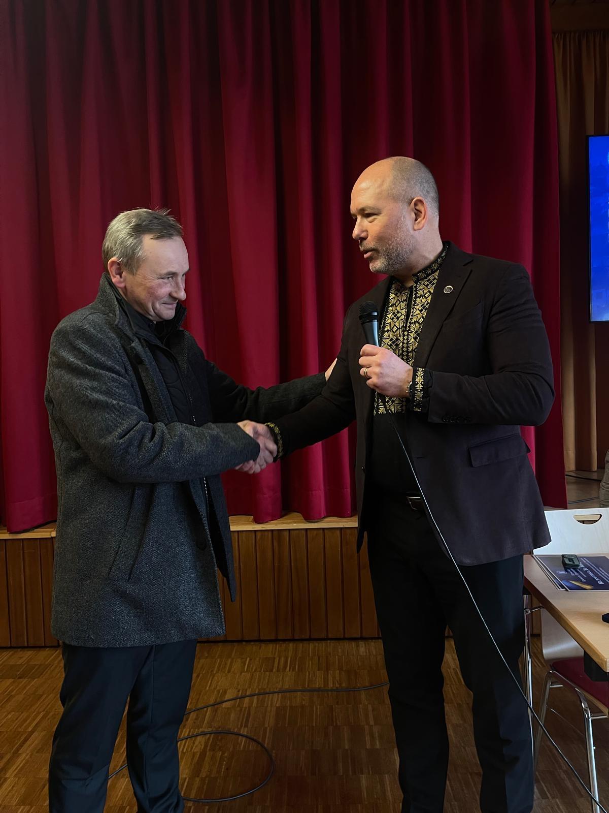 During the community meeting, Grod also presented certificates of recognition to community members for active support of Ukraine, honoring Kateryna Matey and Andriy Nesmachnyi of the Association of Ukrainian Organizations in Germany, as well as active civil leaders Valentyna De Maar and Tamara Okhrimenko.